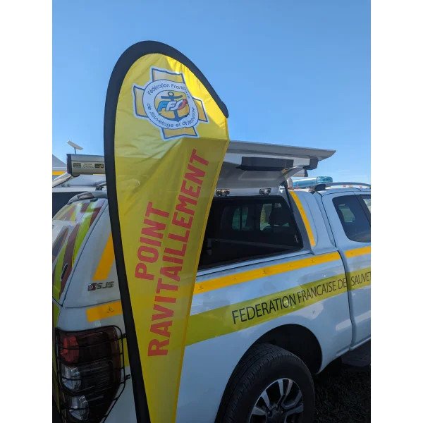Oriflamme publicitaire personnalisé avec fourreau renforcé noir.